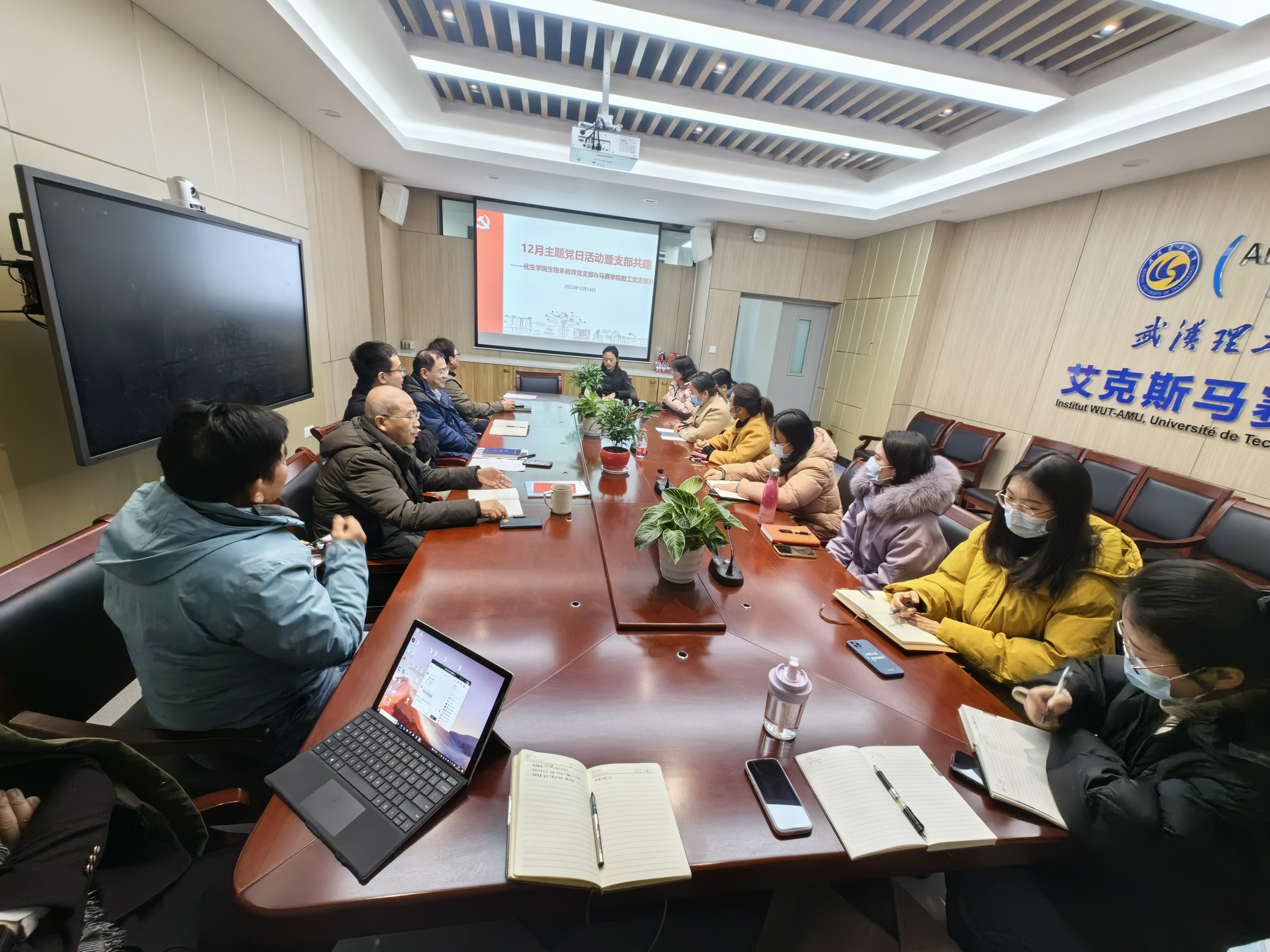 2023年12月14日,马赛学院教工党支部联合化生学院生物系教师党支部在S304会议室共同开展支部共建暨12月份主题党日活动,两个党支部全体党员与马赛学院教职工共20余人参加,马赛学院副院长袁国华、化生学院副院长谢浩以普通党员身份全程参加。本次主题党日活动由化生学院生物系教师党支部书记班宜辉同志与马赛教工党支部书记余艳阳同志联合主持。